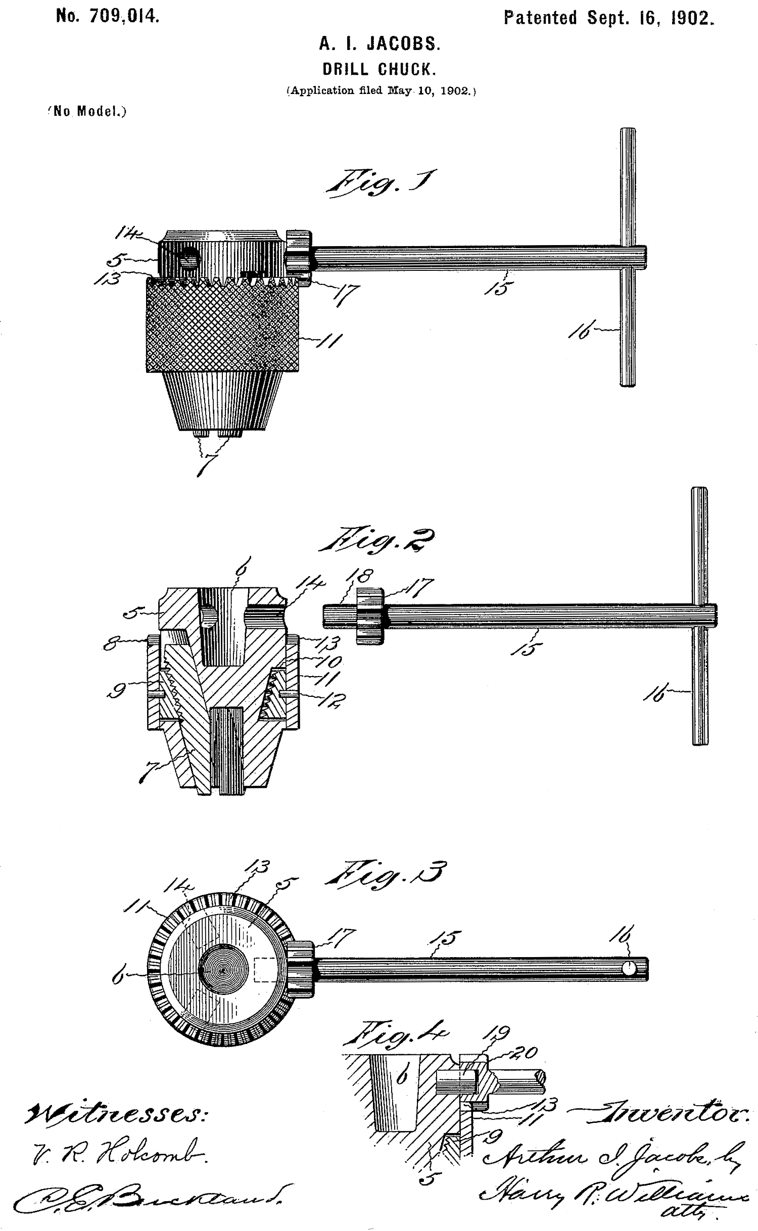 September 16,1902 - A.I. Jacobs recieves his patent for the Drill Chuck. “A.I. Jacobs was working with an old style drill press, trying to hold the belt control with one hand and applying the spanner wrench to the other. The wrench slipped and he badly battered his knuckles. A.I. knew there had to be a better way. In a matter of days, he had developed the first drill chuck with a toothed sleeve and key. A few months later, he founded what would become the Jacobs Chuck Manufacturing Company. The rest, as they say, is history.